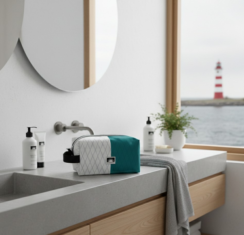 Kulturtasche aus X-Pac High-End-Segeltuch – leicht, wasserdicht und robust. Weit geöffnetes Hauptfach, 2 Innenfächer, seitliche Trageschlaufe und YKK-Reißverschluss. Ideal für Reisen, Sport oder Alltag – stylisch, praktisch und langlebig.